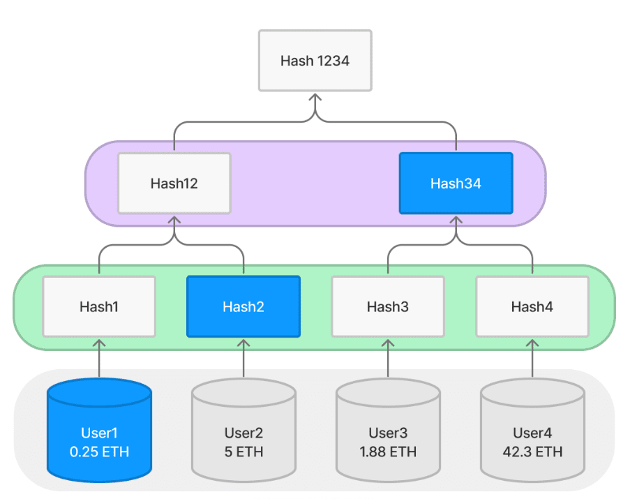 When we need to prove that a certain user is indeed on the tree, such as proving User1 and its balance, we only need to provide the value of the blue node in the figure. User1 only needs to know his user ID and balance, as well as Hash2 and Hash34 (these two hashes are provided by the exchange) to verify whether he is at the root of the tree. Obviously, only giving these few nodes is enough to hash all the way to the root of the tree, and we only need to verify whether the value of the root of the tree matches. We call [User1, Hash2, Hash34] the Merkle proof or path that proves User1.