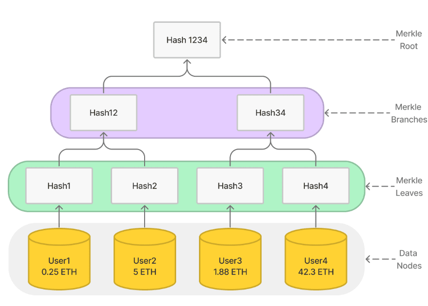 First, let's understand what a Merkle Tree is. A Merkle Tree is a data structure. As shown in the figure, we have 4 pieces of data, each piece of data is a user's ID and balance. Hashing the 4 pieces of data separately constitutes the leaves of the Merkle Tree, and then merging the hash values of the two leaves and hashing them again. In this way, we will get a complete Merkle Tree by iterating. The top node is called the root of the tree. Due to the characteristics of the hash algorithm, any change in any data node will cause the hash value of the root of the tree to change.