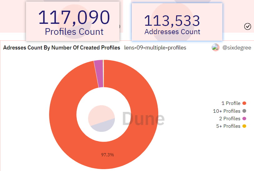 According to official data, the number of Profiles NFTs is 117,000, and the number of wallet addresses that own these Profiles is 113,000. It can be seen that most addresses only own one Profiles NFT. The specific data is that 93.1% of addresses have one Profile, and 2.55% of addresses have 2 profiles.