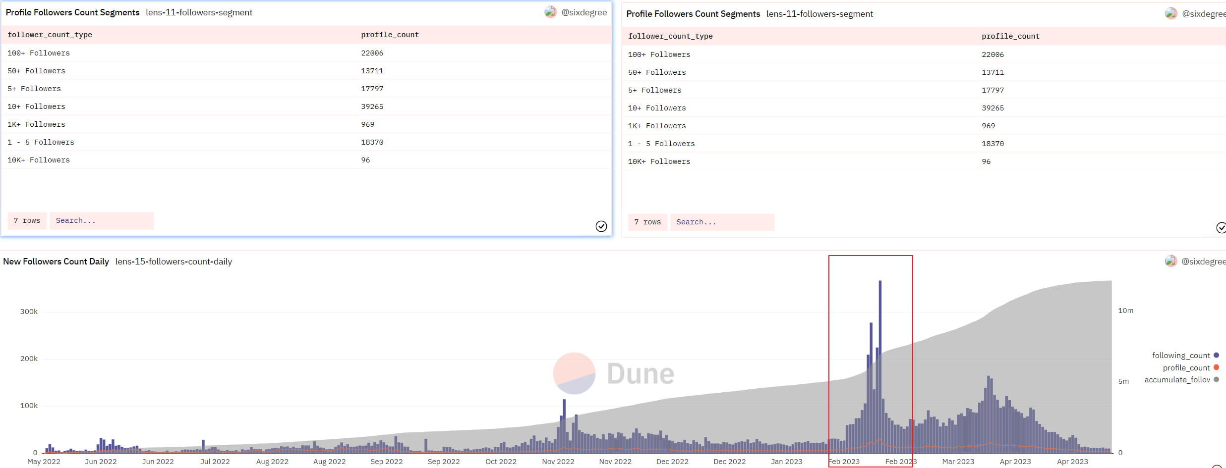 Lens is currently in the beta stage and has not opened account applications. It now has 117,000 profiles. Before February 2023, the number of new followers was about 20,000 per day, the number of accounts followed involved 6,000, the number of articles published per day was between 8,000 and 12,000, and the number of comments per day was about 2,000. Due to the influence of blur and arb airdrops, various data have shown several times growth since February 2023. The monthly active profile has reached more than 60,000. It will continue to be active in the future and needs to be observed.