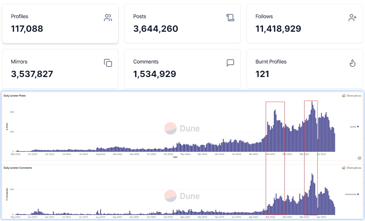 From the number of daily published articles, we can see that for a long period of time before February 1, 2023, the number of articles published on Lens was between 8,000 and 12,000. After February, there were two peaks of articles published, one around February 14 and the other around March 27, which corresponded to the airdrops of Blur and ARB respectively. This shows that the large increase was mainly due to users' expectations of the airdrop.