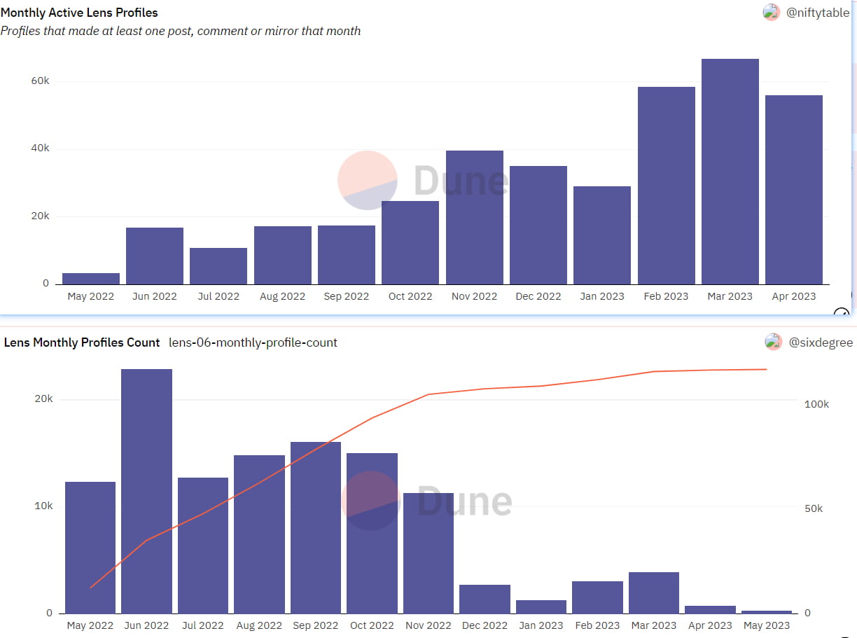 From the perspective of newly added profiles, the largest number of new profiles came from June 2022, and the number of new profiles remained relatively high before October 2022. Since 2023, the number of new profiles has been relatively high in February and March, and it has dropped to the lowest point in history in April. This phenomenon is normal, because Lens is now in the internal testing stage, and the official has stopped obtaining whitelists, that is, stopped minting new profiles. Therefore, as time goes by, the stability of the product is verified, and the price of profiles on opensea is soaring, the official is expected to open the whitelist profile casting again.