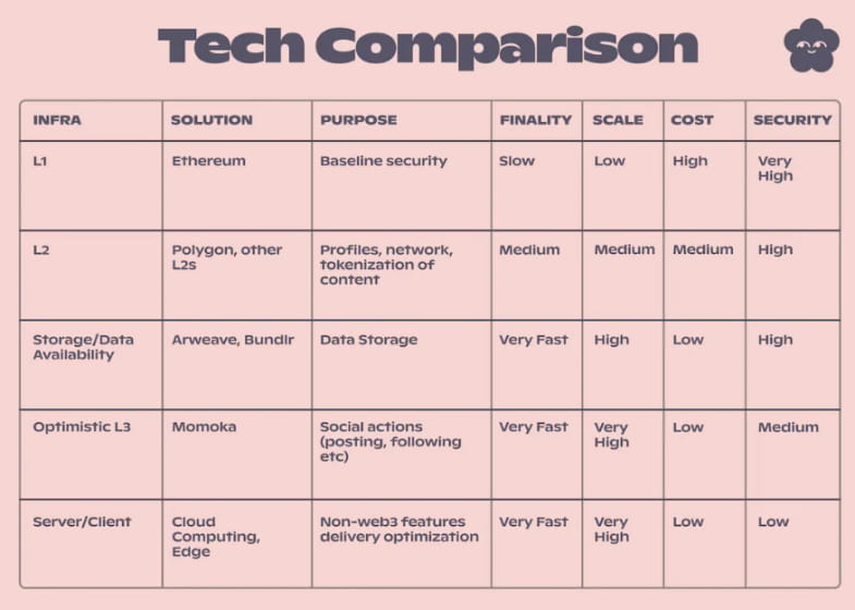 Instead of squeezing transactions to L1 like L2 solutions, Momoka sends transactions to the data availability layer to optimize costs and achieve the higher scalability required for social media networks, avoiding the limitations of block space or block time configurations.