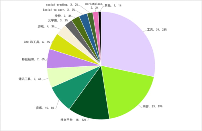 Among them, tool-type products with relatively simple development and clearer ideas ranked first (34, accounting for 28%), followed by content (23, accounting for 19%), social platforms (15, accounting for 12%) and music (9, accounting for 7%), etc. At the same time, there are also a small number of trading platforms (2, accounting for 2%) and social trading (2, accounting for 2%).