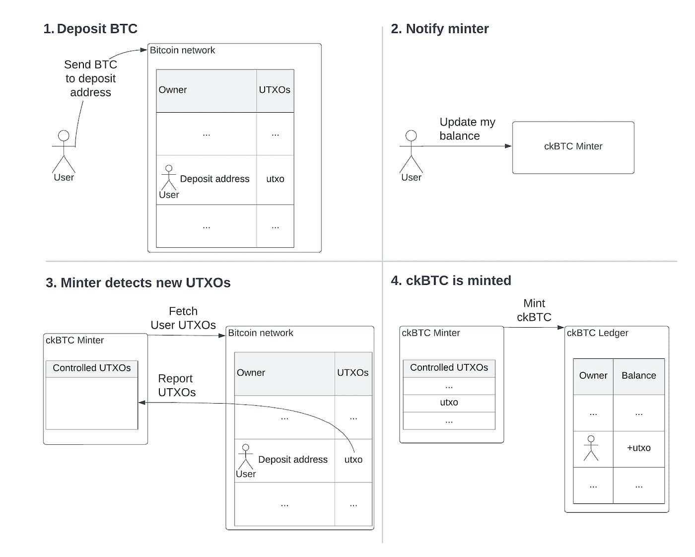 1. The end user first transfers some BTC to a user-specific Bitcoin deposit address, all deposit addresses are fully controlled by the code of the ckBTC minter smart container due to the chain key ECDSA signature, which creates a new UTXO owned by the deposit address;