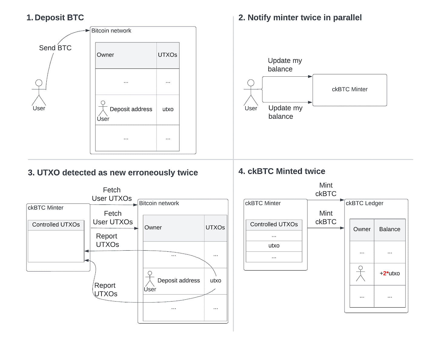 However, now the end user then instructs the ckBTC minter to update the balance twice in quick succession, and on an internet computer these updates can be interacted with other smart contracts simultaneously;