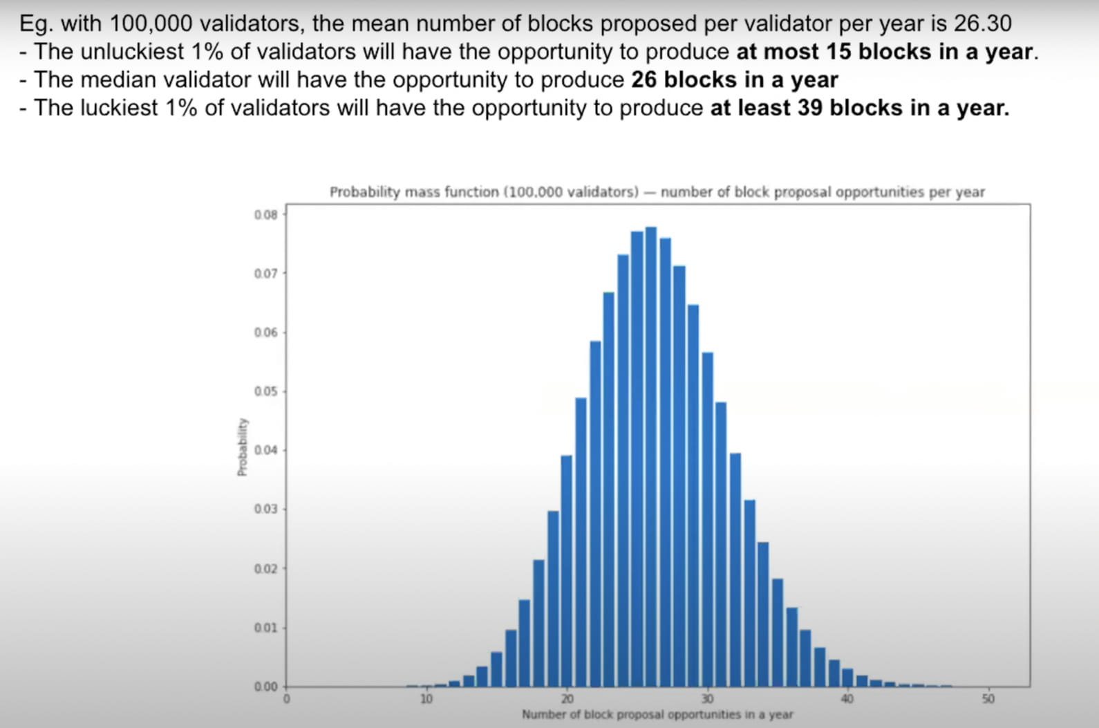 The most important factors affecting APR income are the two rewards of the consensus layer (CL) and the execution layer (EL). As a validator, the rewards of the consensus layer are very small, because every staker who works normally will submit an attestation to get the reward, but as a validator who is only selected as a proposer, the execution layer (EL) reward is obtained. There is a certain probability of obtaining this reward. The number of times a proposer is selected in a year follows a normal distribution. The difference between the luckiest validator and the unluckiest validator in obtaining the execution layer reward will be relatively large. The luckiest validator can submit 39 blocks, while the unluckiest validator can only submit 15. This is reflected in the fact that over a period of time, the APR differences of different staking protocols will be relatively large.