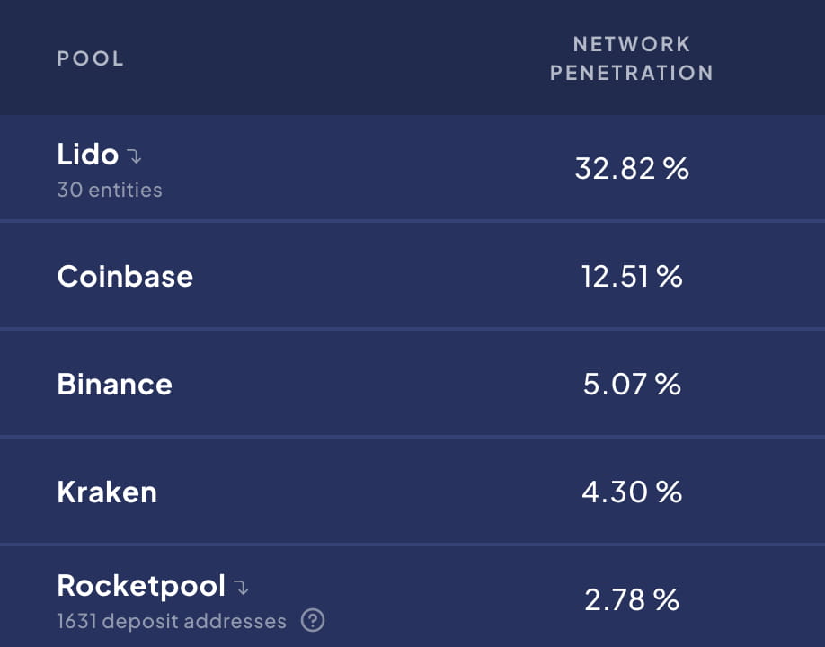 "Network penetration" refers to the stake percentage of a particular mining pool in the entire Ethereum beacon chain. It is calculated by dividing the active stake in the mining pool by the total active stake on the Ethereum beacon chain. Here, "active stake" refers to the balance after adding up 32 ETH as a unit.