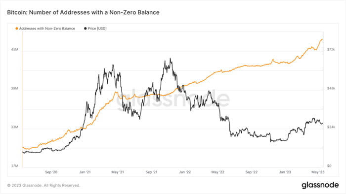 On-chain data from Glassnode shows a surge in the number of new Bitcoin wallets created each day. More importantly, there has been an increase in non-zero balance Bitcoin wallets, exceeding 48 million.