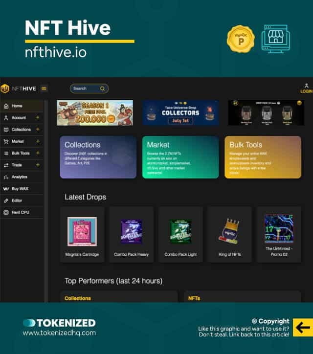 The third-ranked WAX NFT marketplace is NFT Hive. From a purely visual perspective, NFT Hive looks “no frills” and not as appealing as some of its competitors. This is not a negative though, as there is a fair amount of trading activity on the platform. In short, NFT Hive may not look that appealing, but it has everything you’d expect from a marketplace.