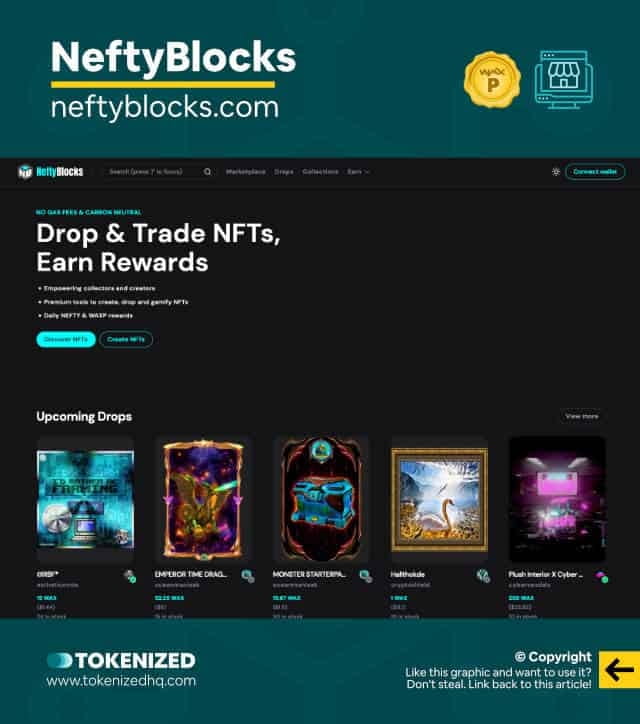 The second-ranked WAX NFT marketplace is NeftyBlocks. Although NeftyBlocks does not have as many brand partners as AtomicHub, it is still a very good choice for those who are interested in the WAX NFT ecosystem. If you are keen on token rewards and other DeFi features, then NeftyBlocks is the best marketplace for you.