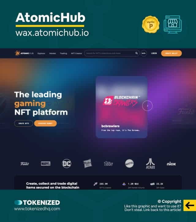 The number one WAX NFT marketplace is AtomicHub. AtomicHub is by far the largest and most professional WAX NFT marketplace. To date, over 285 million NFTs have been created on AtomicHub, with a 24-hour trading volume of over 1.3 million WAX. If you’re looking for a platform with high liquidity, then AtomicHub is the place to be.