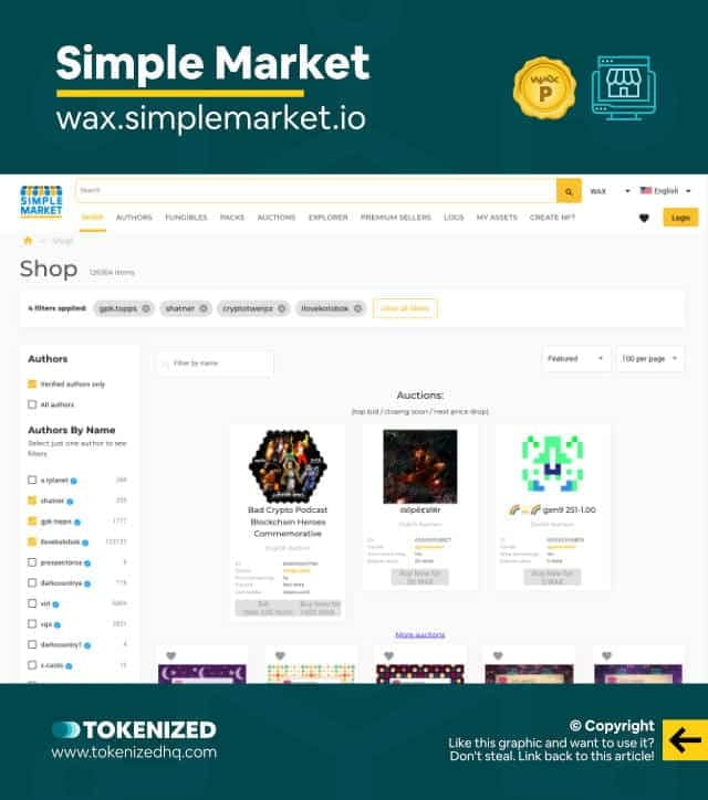 The fourth-ranked WAX NFT marketplace is Simple Market. As its name suggests, Simple Market is another “no frills” platform in the WAX NFT marketplace. However, the great thing about Simple Market is that it really is simple. In contrast to some other NFT marketplaces that can be confusing with complicated terms and complex layouts, Simple Market is very simple and looks like any other online store.