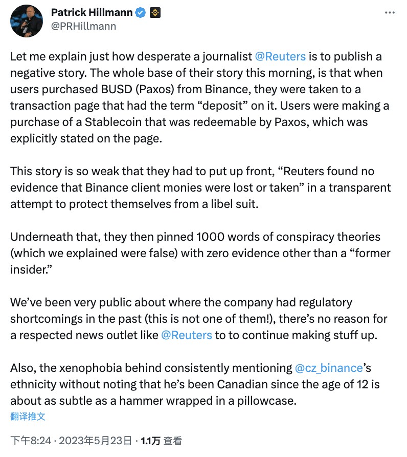 Patrick Hillmann, chief strategy officer of Binance, responded on Twitter to Reuters' report that "Binance had mixed customer funds with company revenue in 2020 and 2021, violating U.S. financial rules requiring separation of customer funds" and said that when users buy BUSD (Paxos) from Binance, they will be transferred to a trading page with the word "deposit". Users are buying stablecoins that can be redeemed by Paxos, which is clearly stated on the page. The statement in the Reuters report that "Reuters found no evidence that Binance customer funds were lost or taken" is an attempt to protect itself from defamation lawsuits.