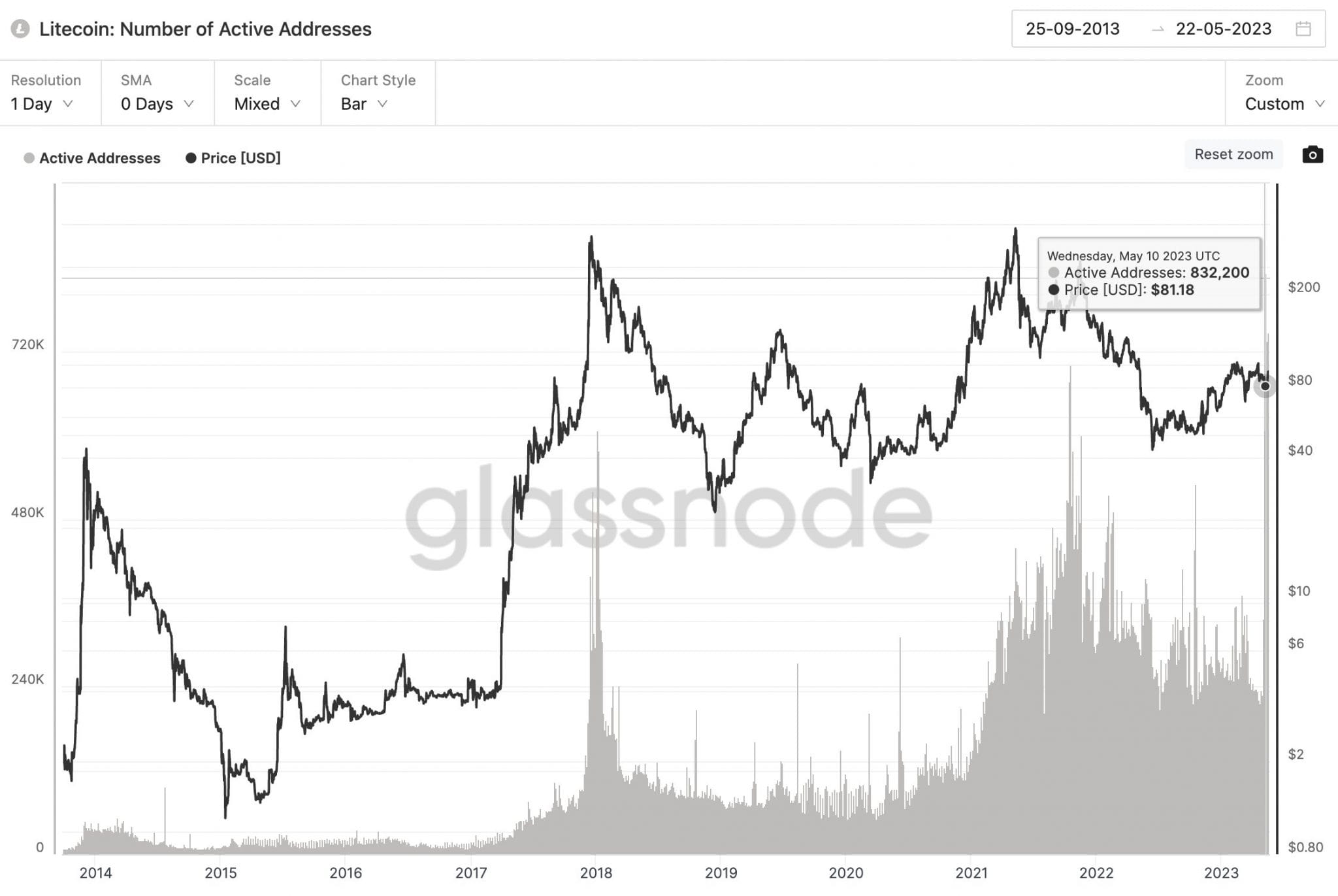Ali took to Twitter to announce that the largest surge in the number of active LTC wallets over the past two years had been detected. He revealed that more than 832,000 LTC addresses were actively interacting within the network as senders or receivers. This spike in LTC active wallets signifies a noteworthy increase in user engagement and activity within the Litecoin community.