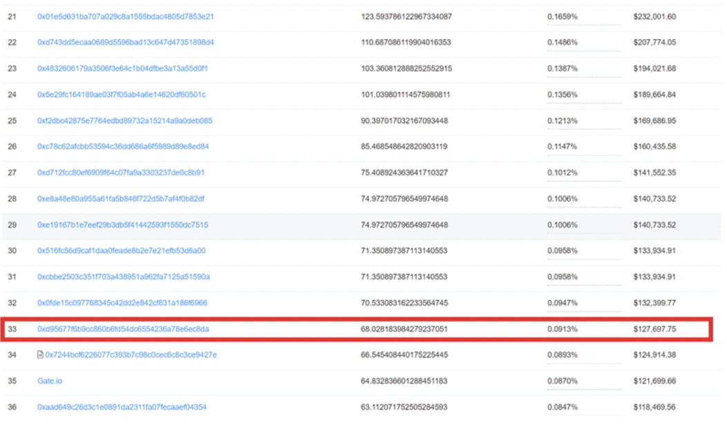 Looking at the top 50 wallets, most seem to belong to exchanges, vesting wallets, and institutions that may be related to the project. You can detect this using transaction labels and transaction frequency. Here we managed to single out the wallet at number 33 in the list of holders (at the time of writing).