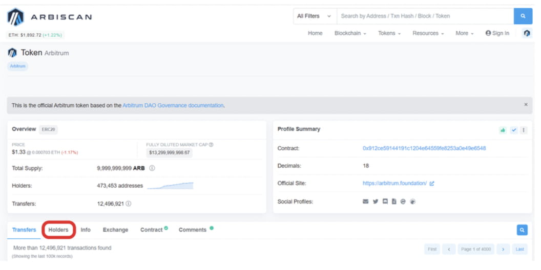To find the top holders of a smart contract token using the web's browser, you first need to obtain the asset's smart contract address and access the browser for more information. Here we will use the Arbitrum token on the Arbitrum Layer 2 network as an example.