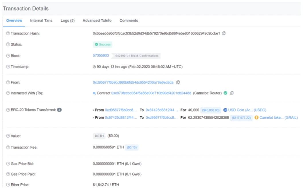 Looking at the wallet (0xD956) there are approximately 68 GRAIL tokens in his custody. 22 of these tokens were purchased on January 17, 2023 for approximately $241 each. GRAIL is trading at $1,899 at the time of writing – that’s over a 780% profit.