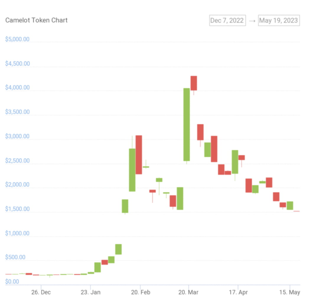 The top holders of some successful smart contract projects are a good starting point in your search for “smart money” investors. To illustrate this, we’ll take a look at the Camelot token (GRAIL) on the Arbitrum network, which has been increasing in value over time: