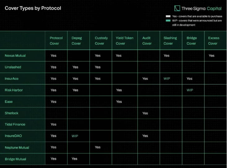 As the decentralized insurance industry develops, various insurance protocols continue to emerge, offering different types of insurance products. A comparison table detailing the different types of coverage offered by existing insurance protocols has been prepared to help readers understand the range of coverage available.