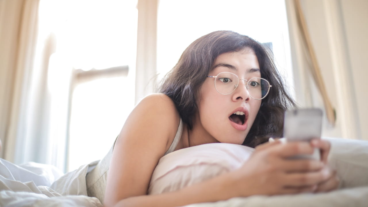 a surprised woman staring at he iphone