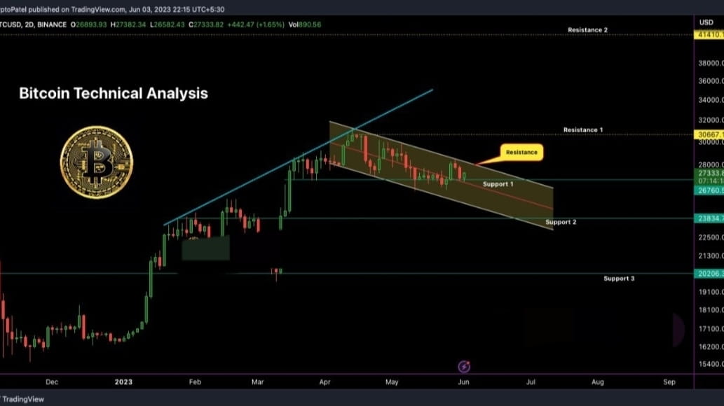 Critical support levels: $26,700, $23,800, and a potential buying opportunity at $20,000