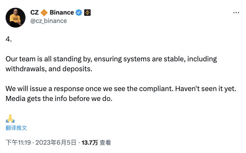 Binance founder and CEO Changpeng Zhao (CZ) posted on Twitter that "the team is on standby to ensure system stability, including withdrawals and deposits. We have not received any notice of lawsuit yet, but will respond once we receive it."