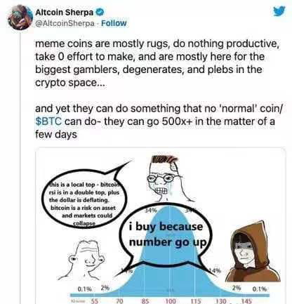 According to Sherpa, meme tokens can do something that “regular” tokens like Bitcoin can’t, which is rise 500x in a matter of days, which also comes as a massive warning to investors.