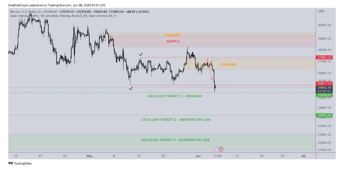 Anonymous cryptocurrency analyst Credible Crypto stated that Bitcoin bulls successfully defended the critical support level at $25,000 following the Monday's drop. According to the analyst, a potential drop below $25,000 could trigger forced liquidations, which may be seen as a positive move to liquidate long positions in BTC. Credible Crypto stated, "I believe we've reached my first target at this point. The current setup suggests that lower prices are just a 'bonus.' It can drop below $25,000 only if it's driven by forced liquidations. If we break above $27,500, we'll likely see a short squeeze and a reversal of the downtrend."