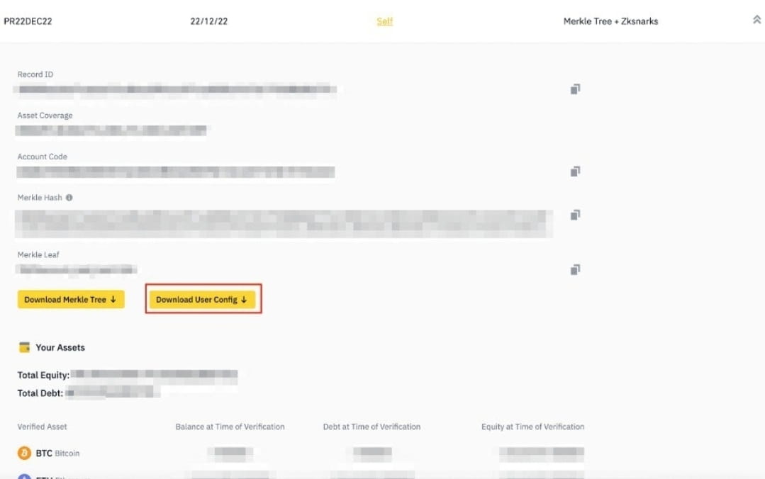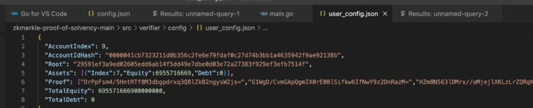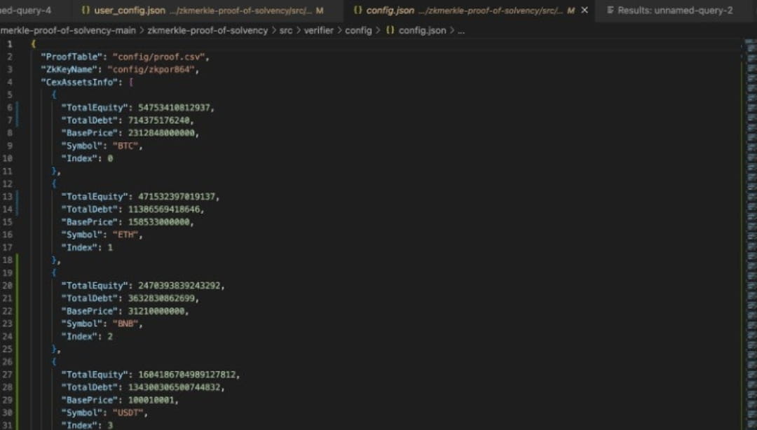 Install the “ZkKeyName” file to display the verification key downloaded in the package. "CexAssetInfo" refers to the total customer balance of all tokens listed on Binance (including all verifiable and non-verifiable assets).