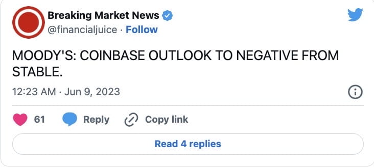 In a June 8 statement, Moody's said the downgrade was due to concerns about the impact of the SEC action on Coinbase’s day-to-day operations.