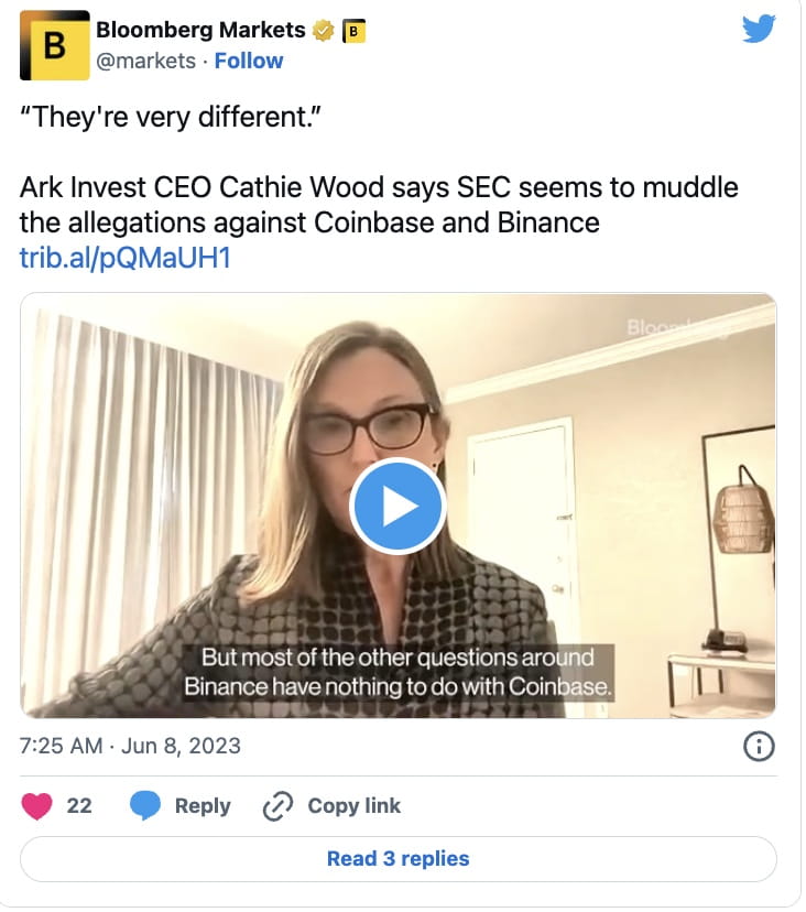While Palmer says Coinbase is un-investable, ARK Invest CEO Cathie Wood doesn’t seem too worried. In an interview with Bloomberg, Wood said the increasing regulatory scrutiny of competitor crypto exchange Binance was ultimately a good thing for Coinbase in the long run.