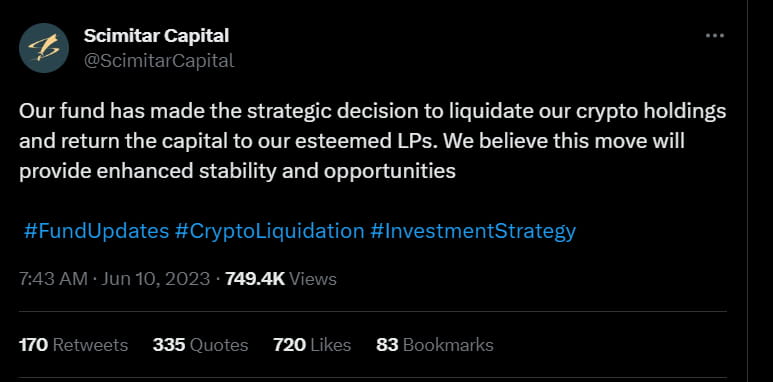 Scimitar Capital confirmed in a tweet On June 10 2023 at around 7am UTC that they have liquidated all of their crypto holdings, and will be returning capital to their esteemed LPs. This came after rumors was flying around that the venture fund went bankrupt and the liquidation of remaining crypto assets in their possession was responsible for the market drawdown.