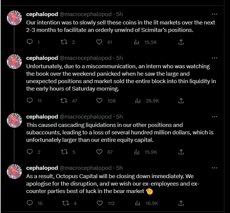 Cephalopod tweeted an announcement that his market making firm, Octopus Capital, took altcoins from Scimitar Capital at 10% discount.