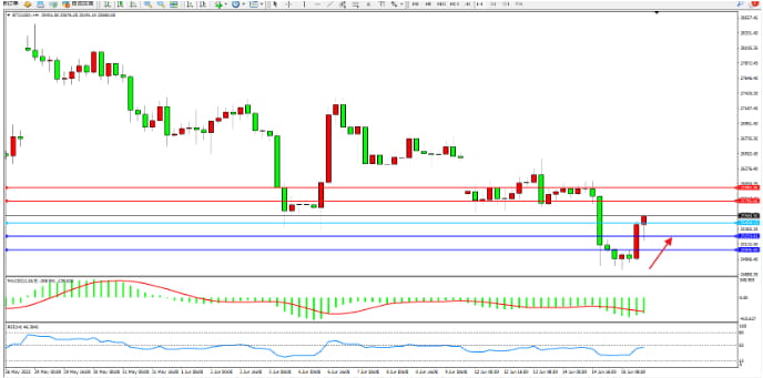 Looking at the 4-hour chart, the low bullish momentum reversed and rose, and the bullish sentiment was strong. There is a trend of continued upward movement in the short term. The MACD indicator is in the bearish zone, and the RSI indicator is in the bearish zone.