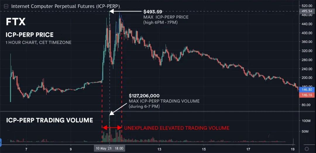 From 6pm to 7pm Pacific time, immediately after network genesis, ICP-PERP’s transaction volume went into overdrive. During this hour, ICP-PERP’s trading volume reached $127,206,000, which is more than 250 times higher than in previous days. Its price reached an all-time high of $494.29. ICP-PERP now directly affects the price of the spot market where ICP is traded in real time. By setting the initial ICP price at such a high level and then maintaining it for a significant period of time, they convinced the public that the opening price range was reasonable.