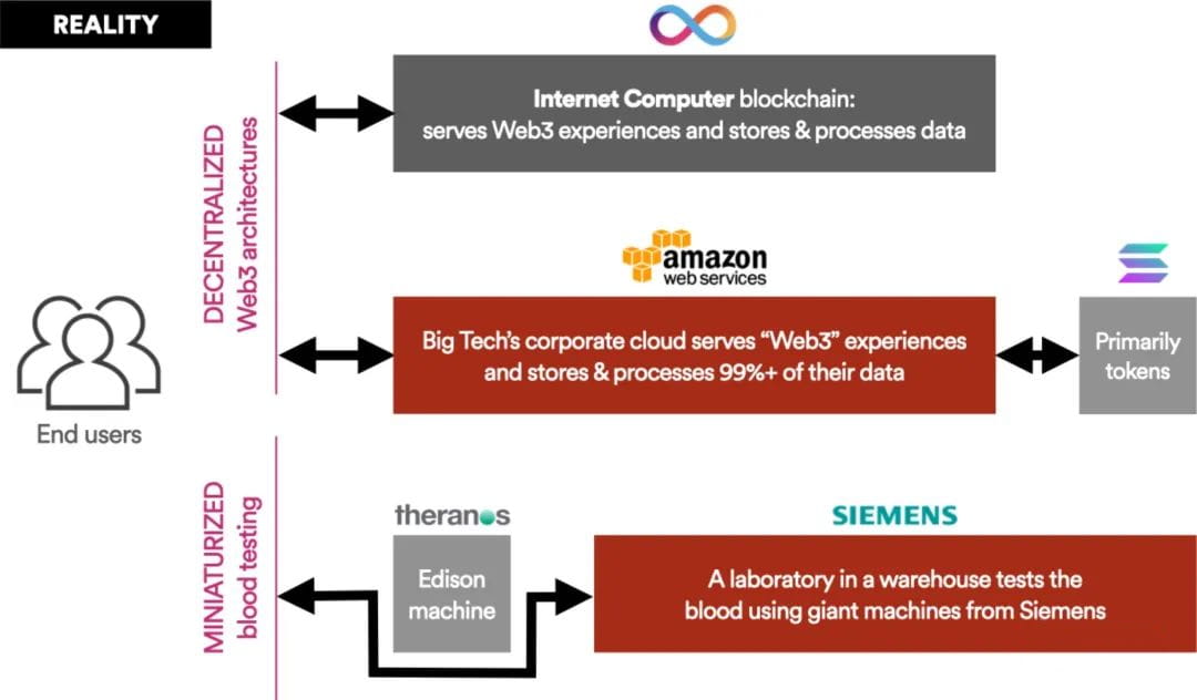 At a high level, the threat Internet computers pose to Solana can be understood with a simple survey: Survey the public interested in blockchain (including journalists and investors) when they hear about Web3 services or applications (i.e., “dapps”). ) how they feel now that they have been "built on Solana". In our experience, everyone we've looked into carefully thinks what this statement means is that the service or application is actually running entirely from the Solana blockchain, an end-to-end Web3 decentralized technology platform: