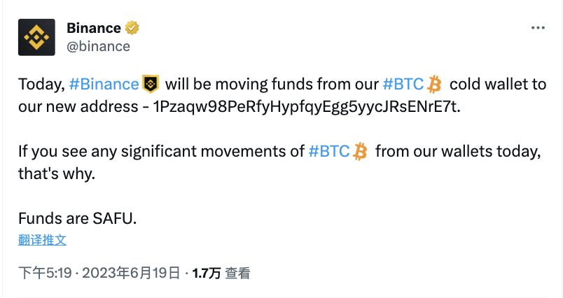 According to Binance's official Twitter account, the Bitcoin reserves will be transferred from the old cold wallet to the new address: 1Pzaqw98PeRfyHypfqyEgg5yycJRsENrE7t today. Large amounts of funds will flow in the future, but user funds will be safe.