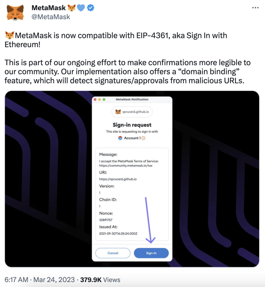 MetaMask officially announced its support for EIP-4361. Many friends are confused about this protocol. On the surface, it is not much different from ordinary signatures. This article explains it for everyone. First of all, you must understand that EIP-4361 is actually a small thing, but the field that can be extended behind it is very large.