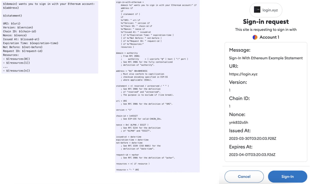 In addition to standardized login, EIP-4361 can also prevent phishing attacks to a certain extent. Currently, a large number of users have their assets stolen by phishing websites every day. EIP-4361 has three steps in the process of wallet login.