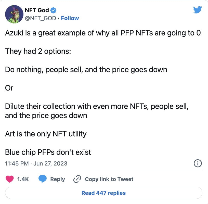 Pseudonymous Twitter influencer NFT God suggested that the mint reflected a broader dilemma that profile-picture (PFP) NFT collections – popularized on social media during the bull run – face during market downturn.