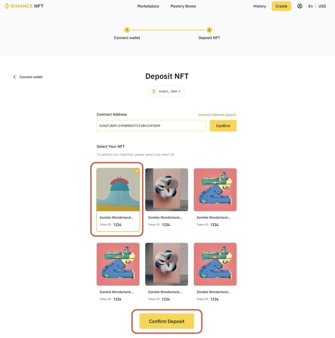 Once your contract address is verified, you will see your NFTs. Select the NFT you want to deposit and click the 'Confirm Deposit' button.