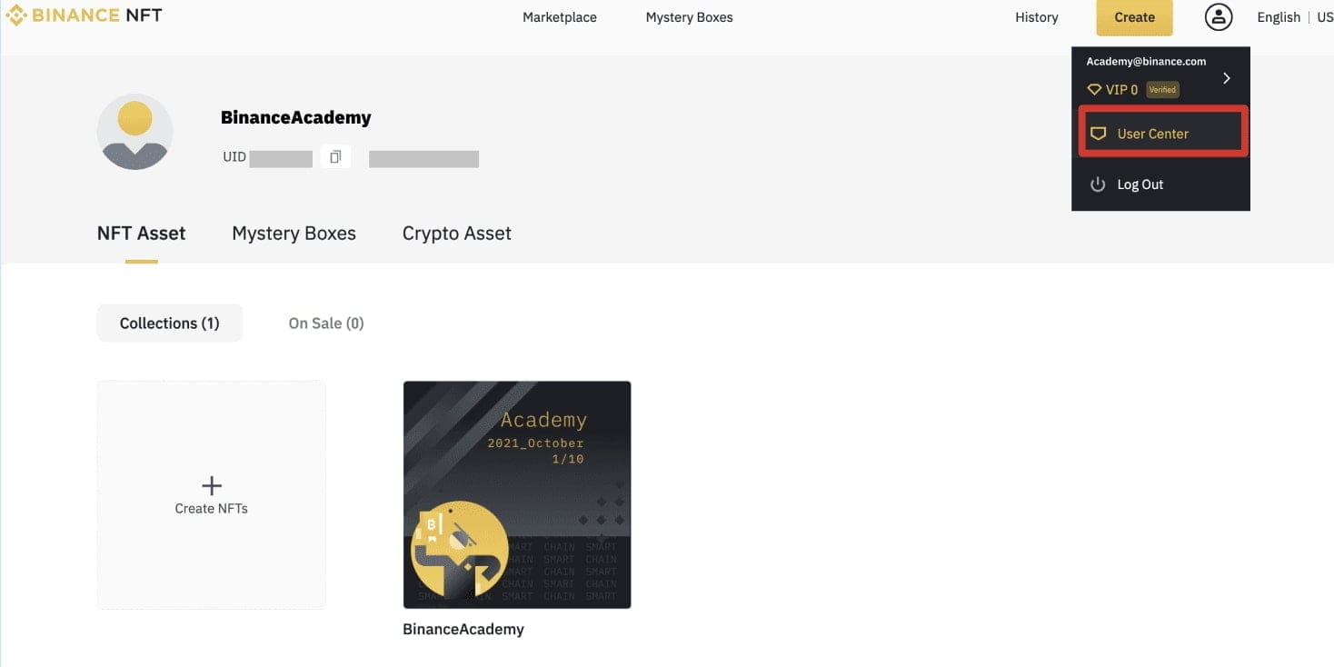 If you want to list an NFT you already own, you can access the 'Collections' section from the 'NFT Assets' section by clicking the 'User Center' tab.