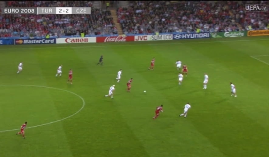 The Czechs panicked and even dispersed. So it was really a question of why not? Before Nihat's second goal and our team's third goal, the Czech defense, which did not leave even the slightest gap for 75 minutes, welcomed Hamit in an amateur manner as in the image below, and Hamit, one of the stars of the match, was passing the ball to Nihat, showing how right it was to play in the midfield. The sound of Nihat's shot coming from the post and the ball going in, the subsequent screams of joy and Tuncay's iconic high jump while celebrating were not even one gram less than what the 11 believing men on the field deserved.