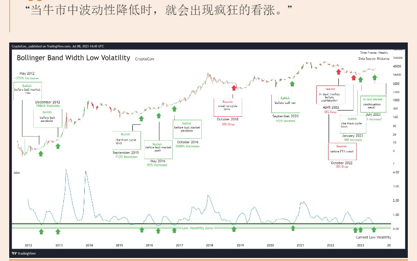 According to this indicator, BTC has entered a low volatility zone, reaching levels seen before the historic bull runs of 2017 and 2021. Analysts enthusiastically stated,