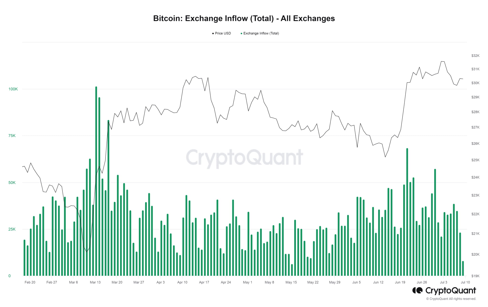Large addresses also resisted the temptation, expressing confidence in Bitcoin’s long-term growth prospects. The exchange whale ratio (i.e., the relative size of the top 10 inflow transactions to total inflows) shows that whale interactions have dropped significantly over the past week.
