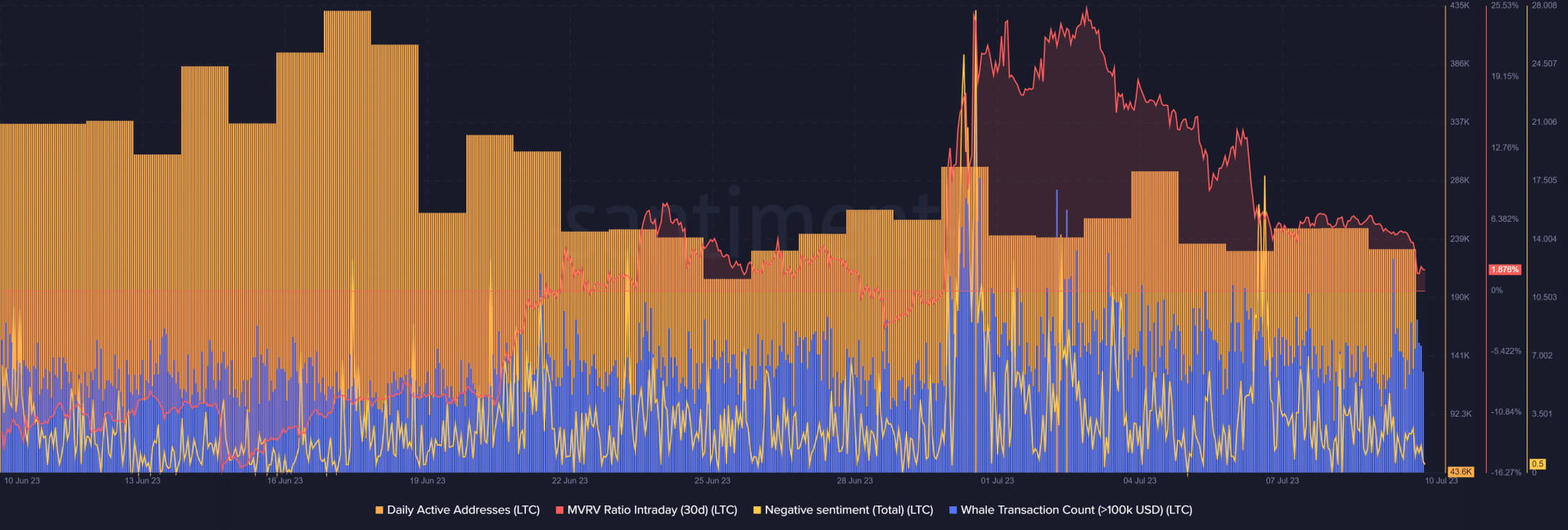 Despite the downward trend, whale activity around LTC has remained fairly stable. However, aside from that, most indicators are bearish. For instance, its daily active addresses have declined over the past 30 days. Its MVRV ratio has also dropped after increasing. On top of that, negative sentiment around the coin has spiked several times over the past few days.