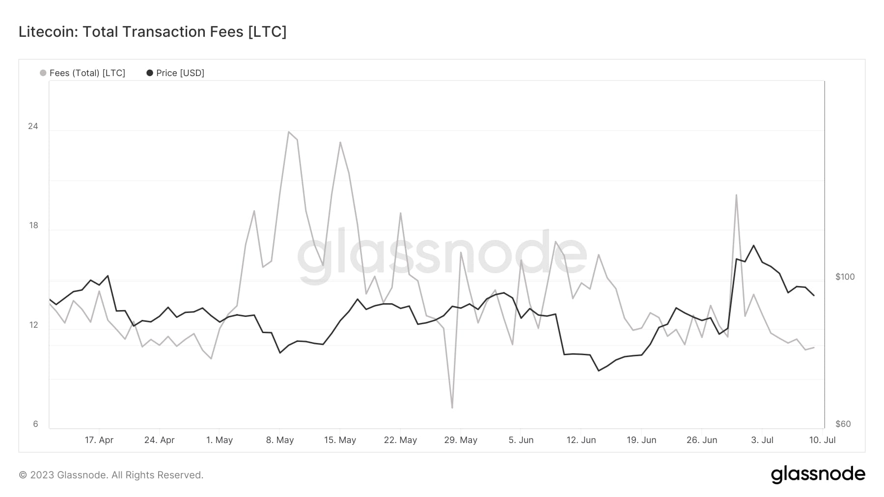 Litecoin’s hashrate has also fallen, reflecting an exodus of miners. Litecoin miner revenue has followed the same trend, also falling.