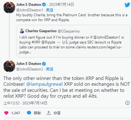 He wrote: "Besides the token XRP and Ripple, the only winner is Coinbase! XRP sold on the exchange is not the sale of a security. Can I attend the meeting on whether to relist XRP? Good day for crypto and all altcoins."