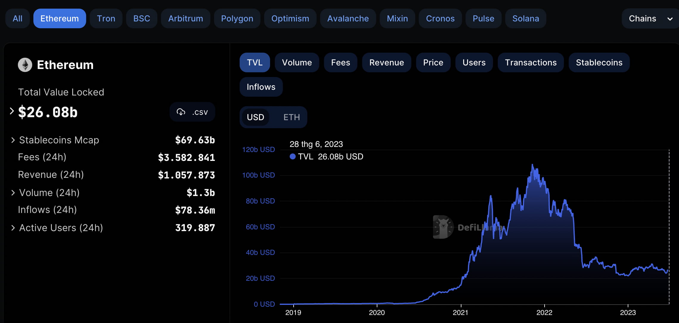 According to Defilama, up to now there have been more than 500 DeFi protocols developed on Ethereum with the total TVL of the entire system currently being $26.08B. The number of $26 billion is not small, especially in a bear market period like today.